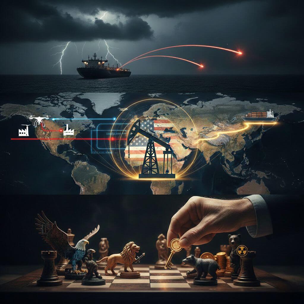 ภาพนี้ถูกออกแบบมาเพื่อสะท้อนถึง “ความซับซ้อนของภูมิรัฐศาสตร์โลก” โดยใช้การเล่าเรื่องผ่านภาพ 3 ส่วน ที่เชื่อมโยงกันตั้งแต่ระดับปฏิบัติการทางทหาร ไปจนถึงกลยุทธ์ระดับมหาอำนาจครับ