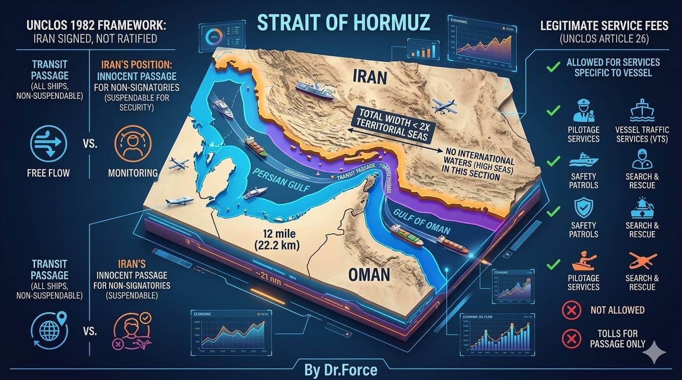 (2) อนุญาตให้เก็บค่าบริการ (Service Fees Allowed): รัฐชายฝั่งมีสิทธิอันชอบธรรมในการเรียกเก็บ “ค่าธรรมเนียมสำหรับบริการเฉพาะที่จัดให้แก่เรือ” ในบริบทของช่องแคบฮอร์มุซที่มีการจราจรทางน้ำหนาแน่นและมีสภาพภูมิประเทศที่ซับซ้อน อิหร่านได้จัดเตรียมบริการต่างๆ เพื่อความปลอดภัยในการเดินเรือ เช่น