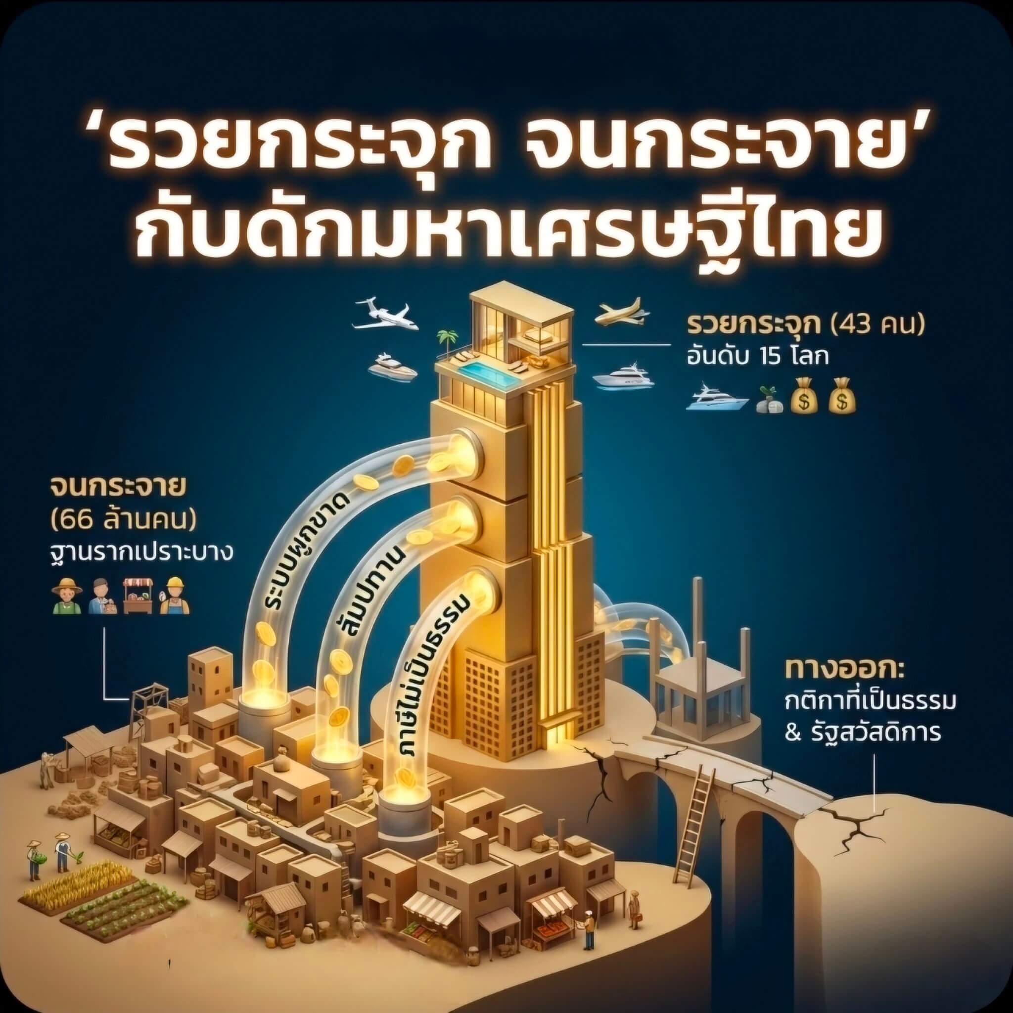 การกระจายรายได้ไม่ใช่การแจกเงิน แต่คือการ “แจกโอกาส” และ “สร้างกติกาที่เป็นธรรม” เพื่อให้ความมั่งคั่งของชาติ ไม่ได้ถูกขังอยู่ในกระเป๋าของคนเพียง 43 คน แต่หมุนเวียนหล่อเลี้ยงคนไทยอีกกว่า 66 ล้านคนให้เติบโตไปด้วยกันครับ