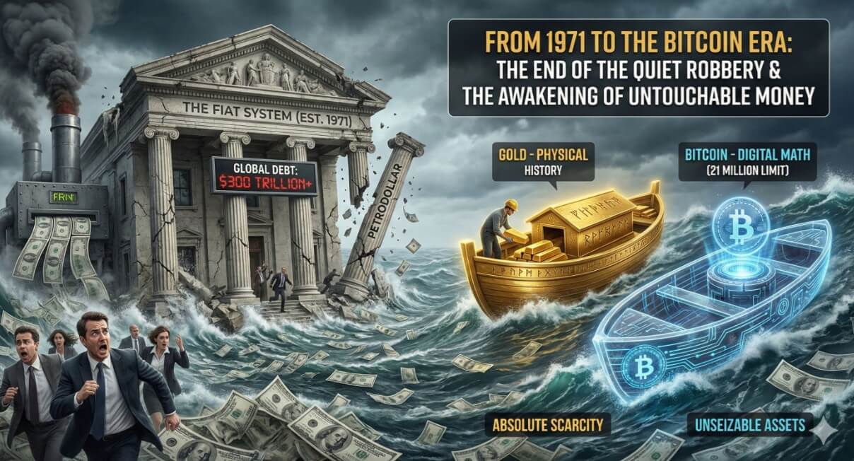 3.1 พาดหัวภาพ: “FROM 1971 TO THE BITCOIN ERA: THE END OF THE QUIET ROBBERY & THE AWAKENING OF UNTOUCHABLE MONEY” (จากปี 1971 สู่ยุค Bitcoin: จุดจบของการปล้นเงียบ และการตื่นรู้ของเงินที่ใครก็แตะต้องไม่ได้)