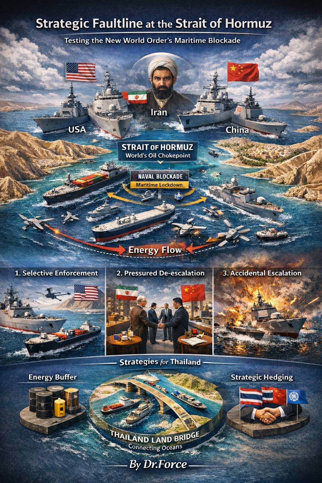 รอยเลื่อนทางยุทธศาสตร์ที่ช่องแคบฮอร์มุซ – เมื่อการปิดล้อมทางทะเลทดสอบระเบียบโลกใหม่ /โดย Dr.Force
